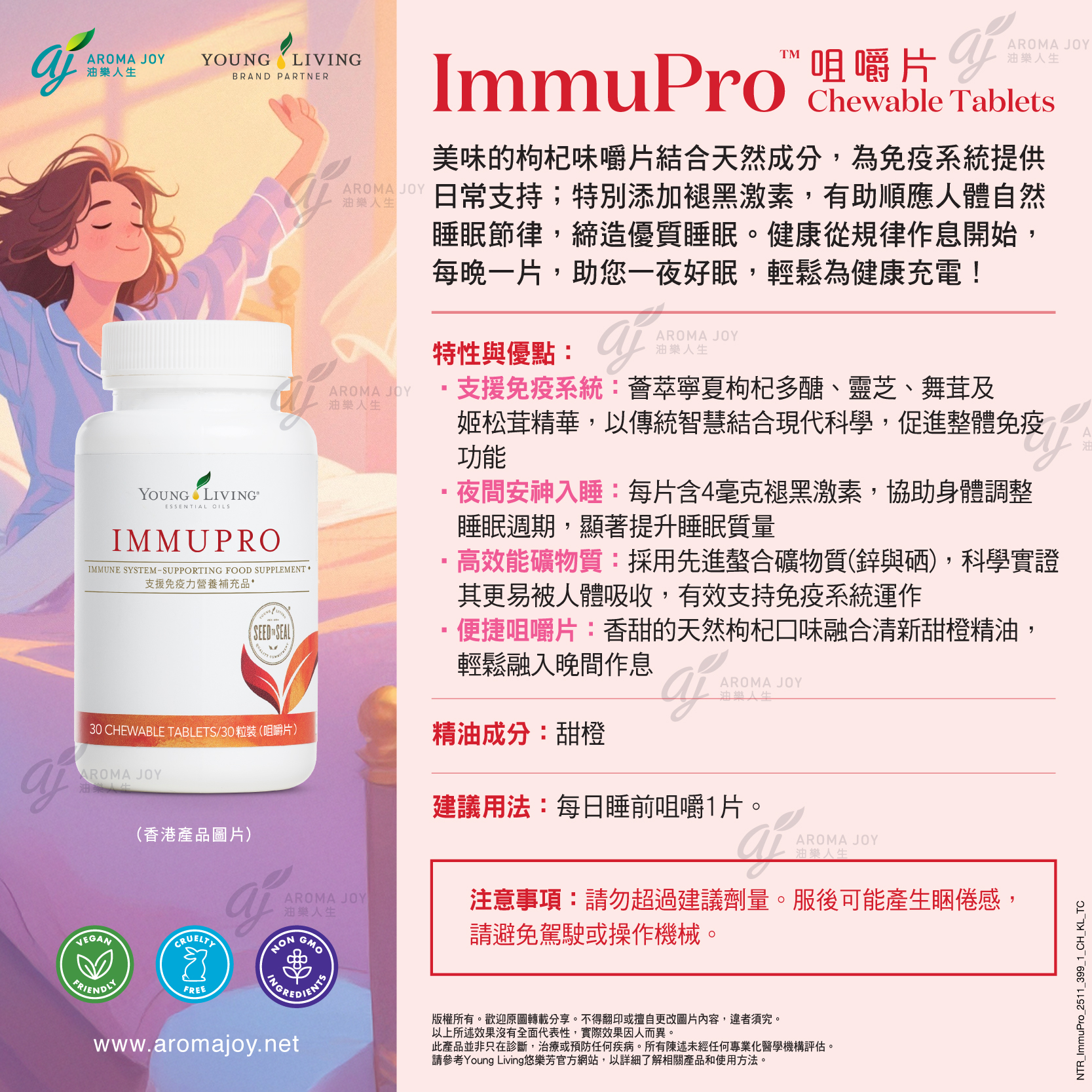 美味的枸杞味嚼片結合天然成分,為免疫系統提供日常支持;特別添加褪黑激素,有助順應人體自然睡眠節律,締造優質睡眠。健康從規律作息開始,每晚一片,助您一夜好眠,輕鬆為健康充電!