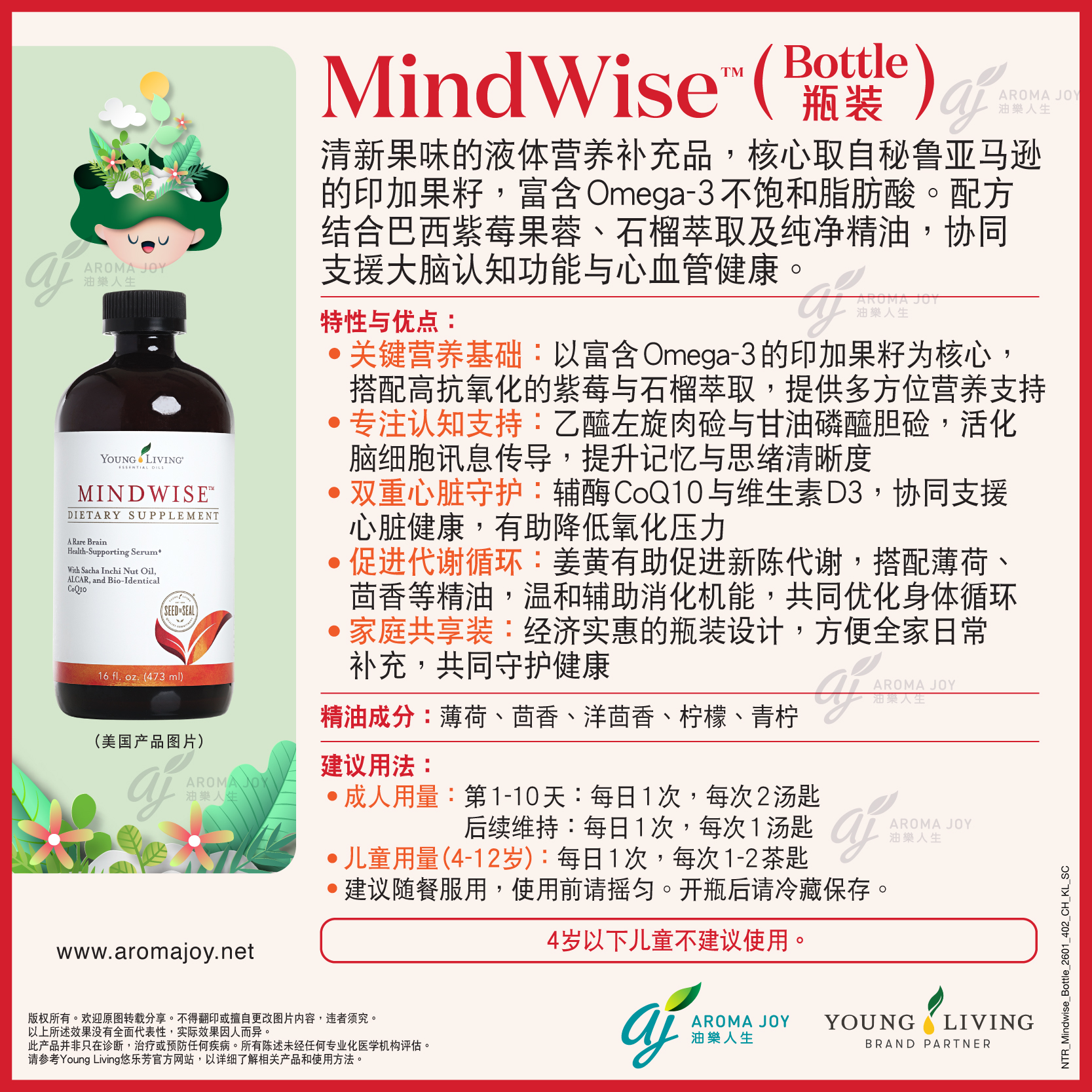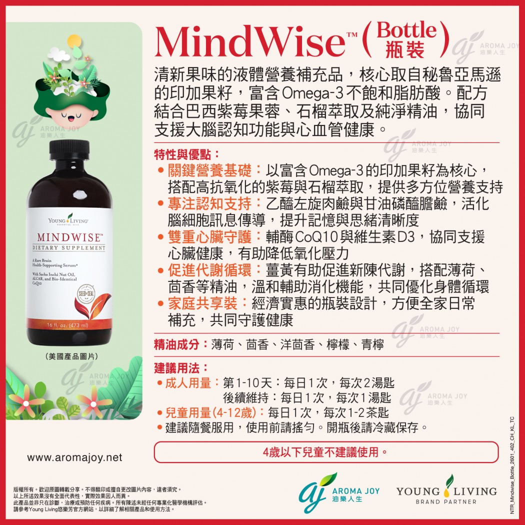 清新果味的液體營養補充品,核心取自秘魯亞馬遜的印加果籽,富含Omega-3不飽和脂肪酸。配方結合巴西紫莓果蓉、石榴萃取及純淨精油,協同支援大腦認知功能與心血管健康。