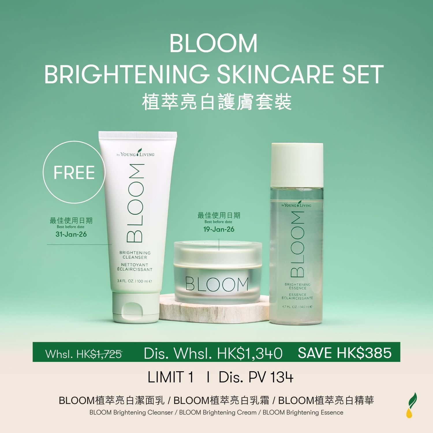 BLOOM BRIGHTENING SKINCARE SET 植萃亮白護膚套裝專為追求透亮肌膚的您設計。全套裝採用天然植物萃取成分,溫和有效地改善膚色不均、淡化暗沉。潔面乳深層清潔的同時保持肌膚水潤平衡;亮白精華富含美白活性成分,針對性改善色斑和膚色暗沉;亮白乳霜質地輕盈,鎖住水分同時提亮膚色。三步驟簡單護理,讓您重現肌膚自然光采!