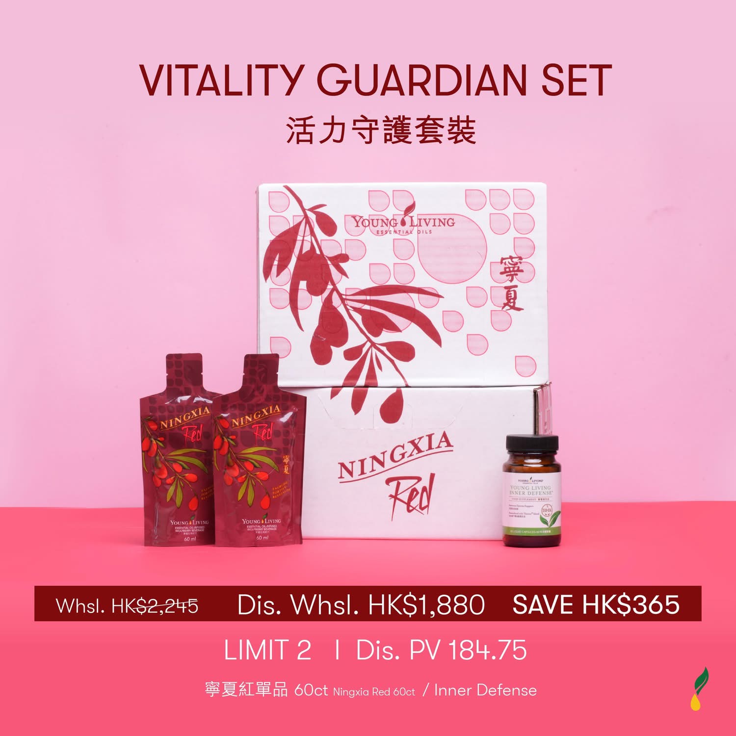 VITALITY GUARDIAN SET 活力守護套裝為您的健康提供全方位保護。寧夏紅單品富含多種抗氧化成分和維生素,有助於提升身體活力、增強體力;Inner Defense含有獨特的精油配方,支持免疫系統健康,幫助身體抵抗外界威脅。兩者完美結合,從內在活力到外在防護,為您的健康築起堅實防線,讓您每天都充滿活力與能量!