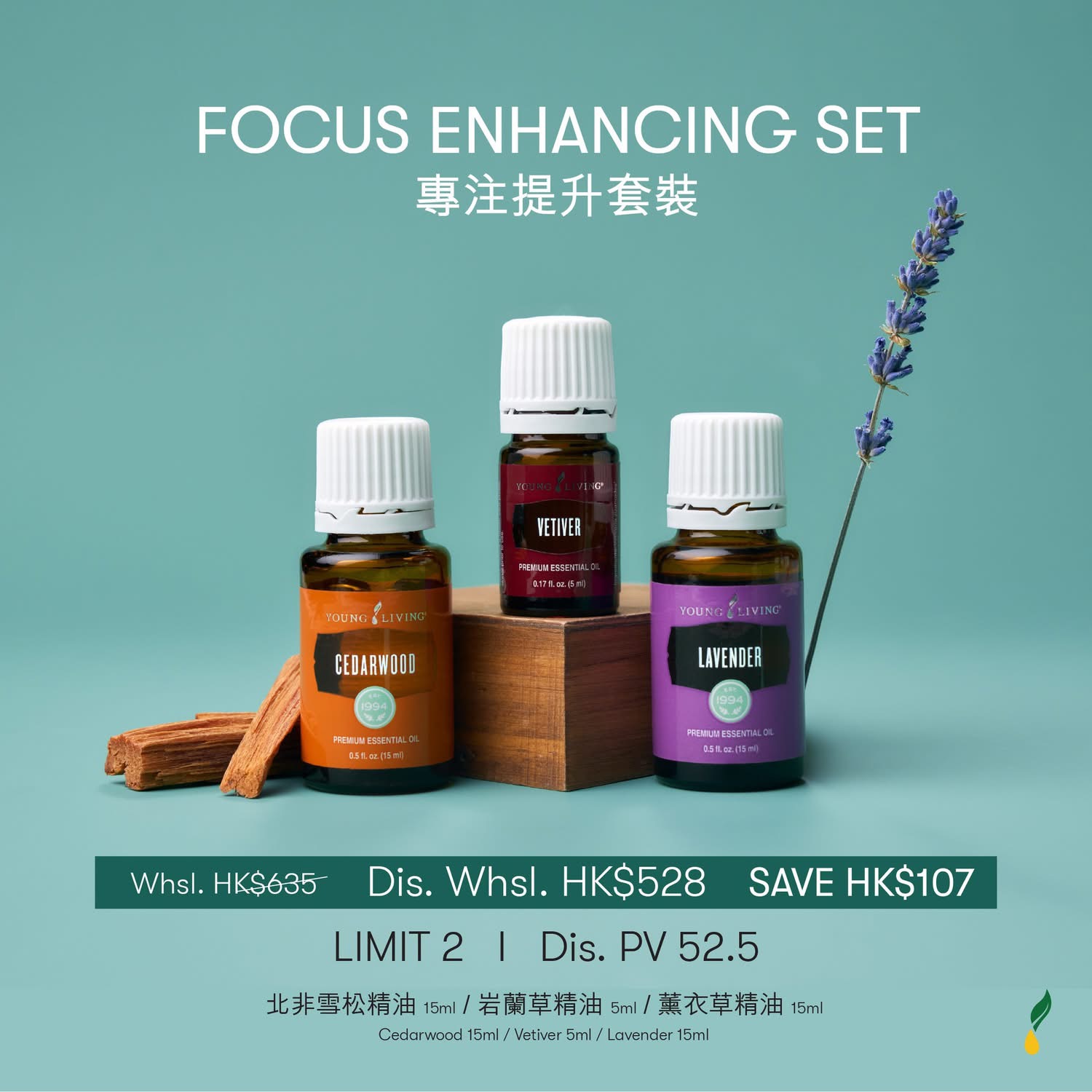 FOCUS ENHANCING SET 專注提升套裝精選三款有助於提升專注力與心智清晰度的精油。北非雪松精油具有溫暖的木質香氣,能幫助安定心神、提升專注;岩蘭草精油被稱為「寧靜之油」,有助於深度放鬆同時保持頭腦清晰;薰衣草精油溫和舒緩,能緩解緊張情緒,創造理想的學習與工作環境。三款精油協同作用,為您打造完美的專注空間!