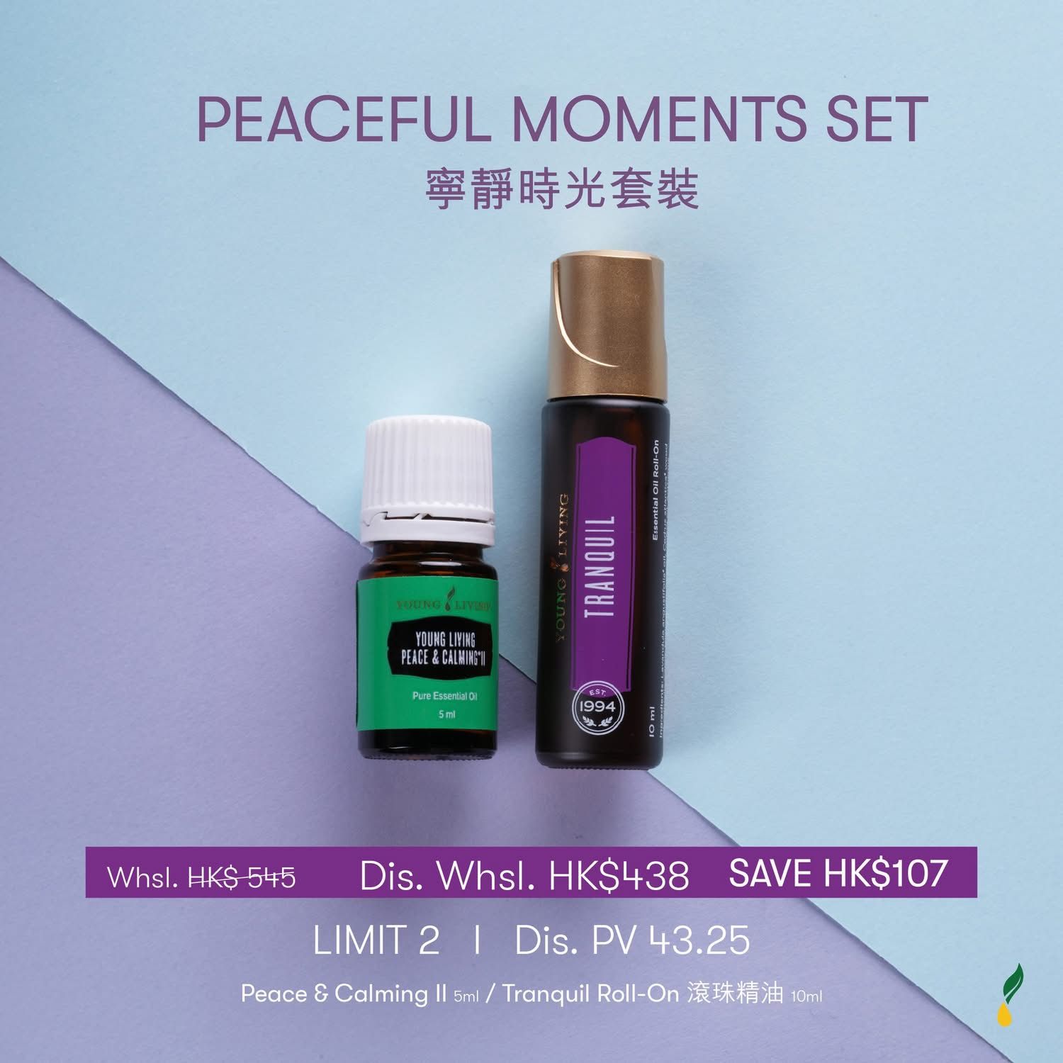 PEACEFUL MOMENTS SET 寧靜時光套裝專為現代忙碌生活設計,幫助您在紛擾中找到內心平靜。Peace & Calming II 結合了多種舒緩精油,能有效緩解壓力、促進放鬆,創造和諧的心靈環境;Tranquil Roll-On 便攜設計,隨時隨地為您提供即時的舒緩效果,適合在緊張工作或學習後使用。兩款產品完美搭配,為您打造專屬的寧靜時刻,重拾內心的平衡與安寧。
