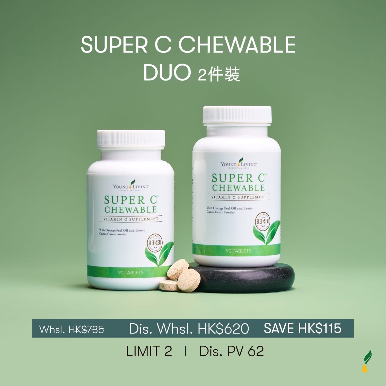 SUPER C CHEWABLE DUO 是一款美味易服的維生素C補充品,採用方便的咀嚼片形式,適合全家大小使用。每片含有高濃度維生素C,有助於增強免疫力、促進膠原蛋白合成並提供抗氧化保護。天然橙子口味,讓補充營養成為一種享受。2件裝組合讓您以更優惠的價格儲備健康,隨時為身體提供所需的維生素C支持!
