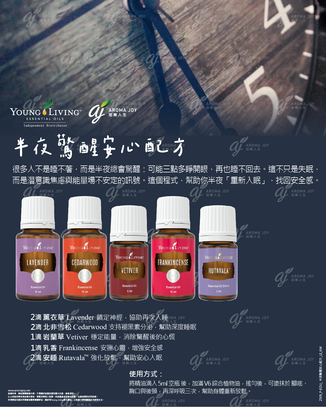 將精油滴入5ml空瓶後,加滿V6綜合植物油,搖勻後,可塗抹於腳底、胸口與後頸,再深呼吸三次,幫助身體重新放鬆。