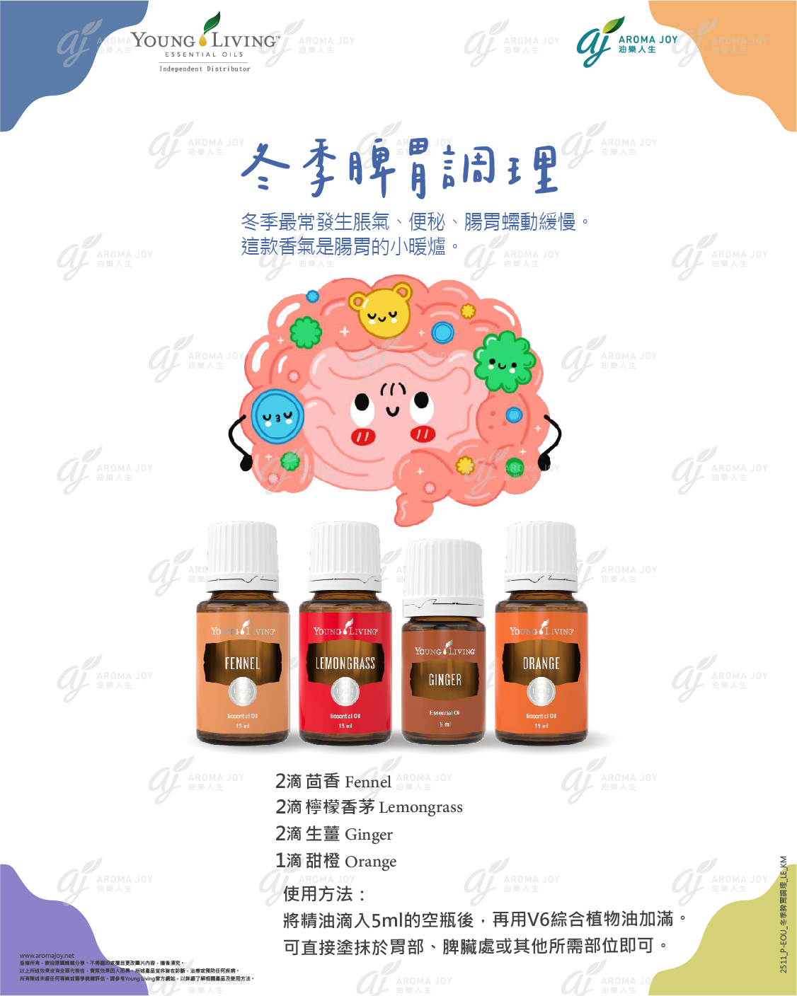 使用方法:將精油滴入5ml的空瓶後,再用V6綜合植物油加滿。可直接塗抹於胃部、脾臟處或其他所需部位即可。