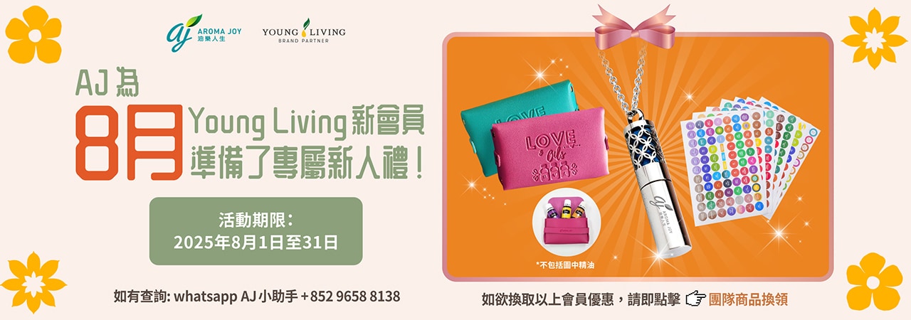 • 此優惠僅限於 Aroma Joy 會員,每位 8月 Young Living 新會員 限領一份禮品。每位會員需登入AJ網站 www.aromajoy.net 登記換領;若初次提交申請,請等待批核。