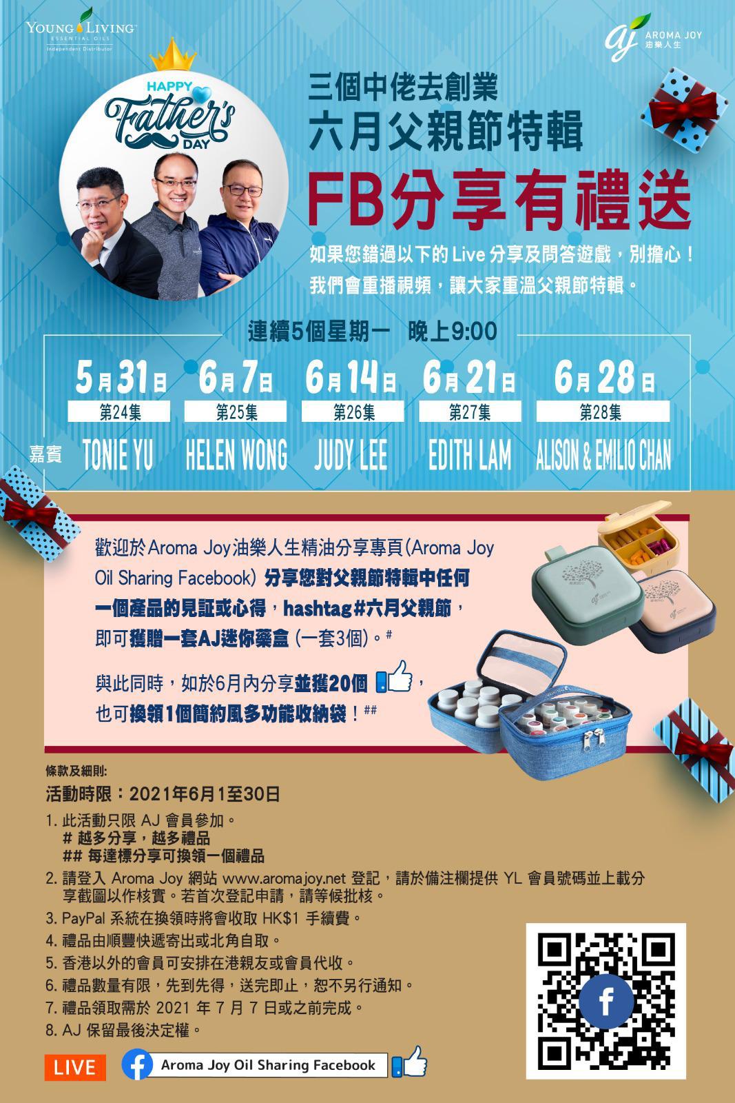 歡迎於Aroma Joy 油樂人生精油分享專頁(Aroma Joy Oil Sharing Facebook) *分享您對父親節特輯中任何一個產品的見証或心得,hashtag #六月父親節特輯,即可獲贈一套AJ迷你藥盒* (一套3個)。#