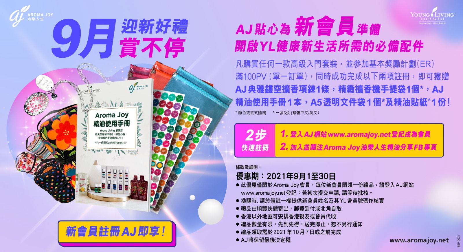 ● 此優惠僅限於Aroma Joy 會員, 每位新會員限領一份禮品。請登入AJ網站 www.aromajoy.net 登記; 若初次提交申請, 請等待批核。