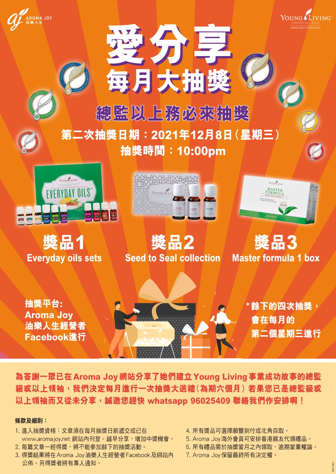 為答謝你們的貢獻,Aroma Joy 每月進行一次抽獎大送禮 (為期六個月)。若果您已是總監級或以上會員而又從未分享,誠邀您趕快把文章交予whatsapp 96025409 聯絡我們作安排啊!