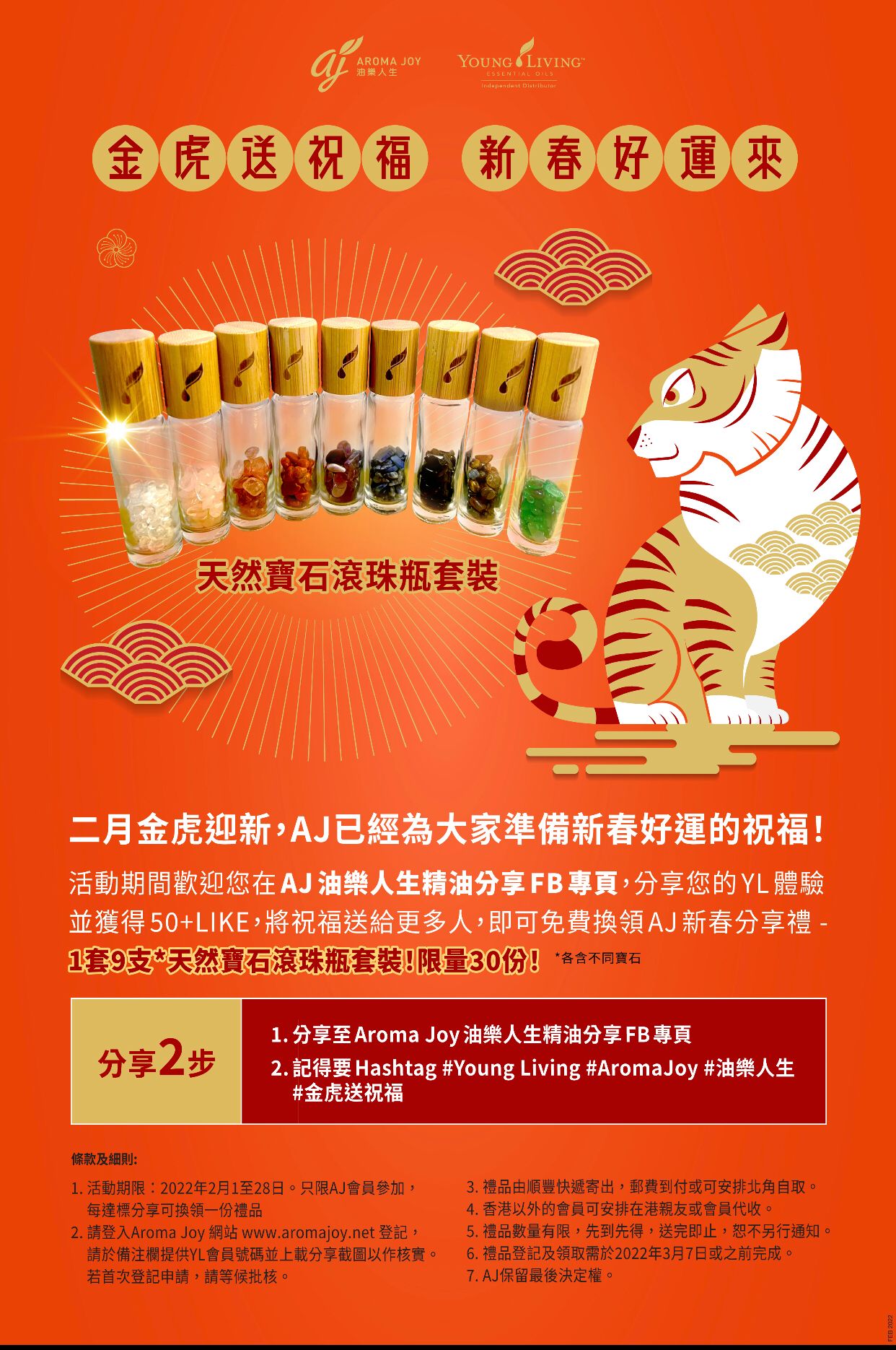 活動期間歡迎您在AJ油樂人生精油分享FB專頁,分享您的VL體驗並獲得50+LIKE,將祝福送給更多人,即可免費換領AJ 新春分享禮 -19*天然寶石滾珠瓶套裝!限量30* 各含不同寶石