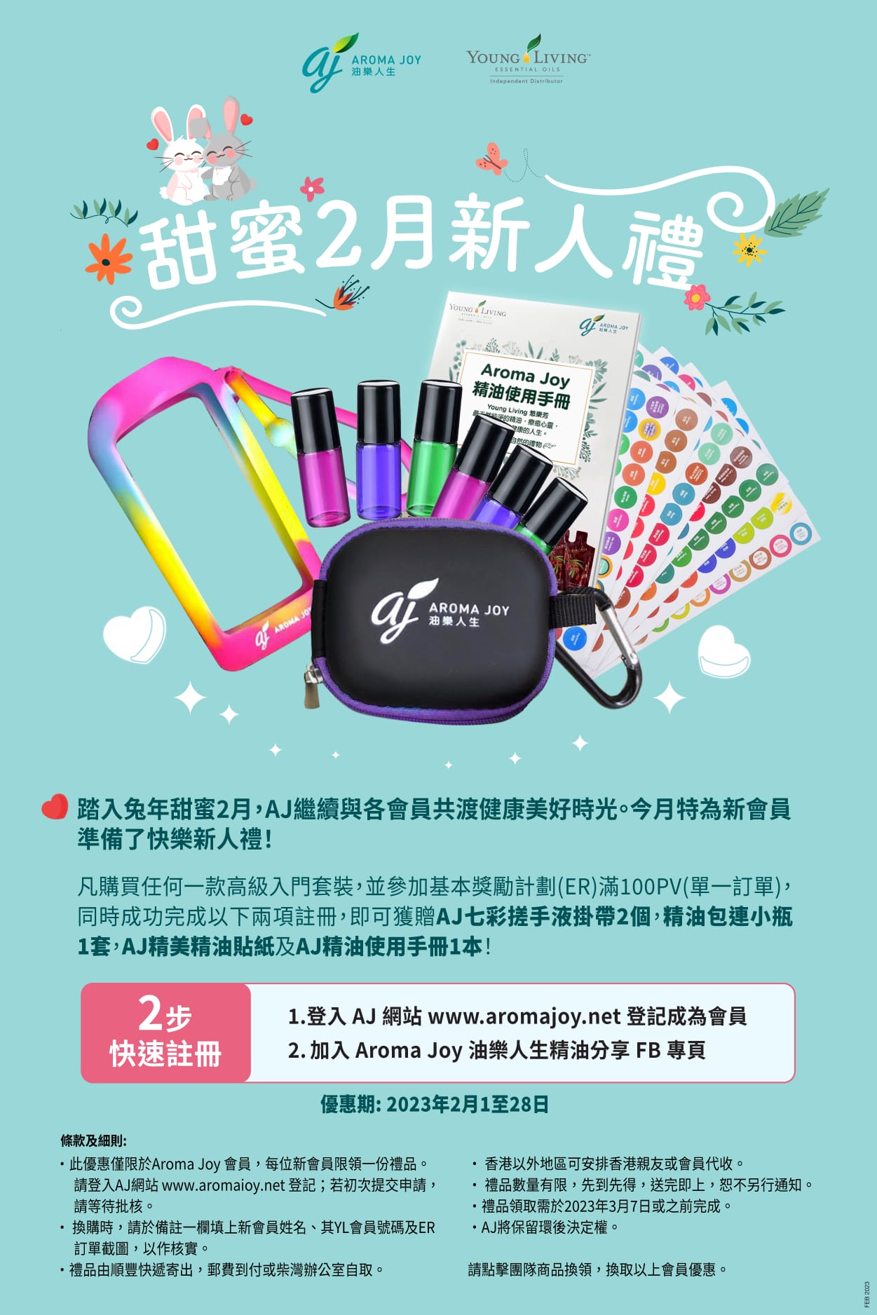 凡購買任何一款高級入門套裝,並參加基本獎勵計劃(ER)滿100PV(單一訂單),同時成功完成以下兩項註冊,即可獲贈AJ七彩搓手液掛帶2個,精油包連小瓶1套,AJ精美精油貼紙及AJ精油使用手冊1本!