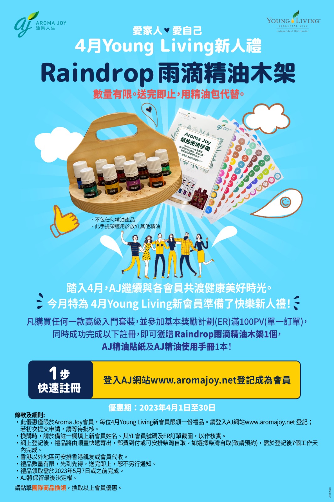 •此優惠僅限於Aroma Joy會員,每位4月Young Living新會員限領一份禮品。請登入AJ網站www.aromajoy.net 登記;