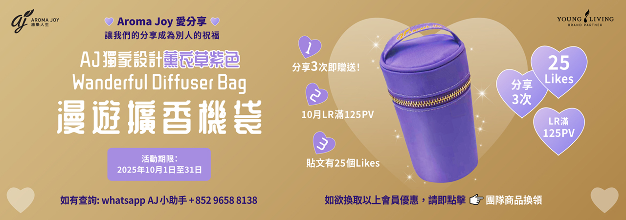 快來跟大家分享 3次 您的YL產品生活體驗或心得,便能獲得AJ獨家設計 Wanderful Diffuser Bag 漫遊擴香機袋*1個。