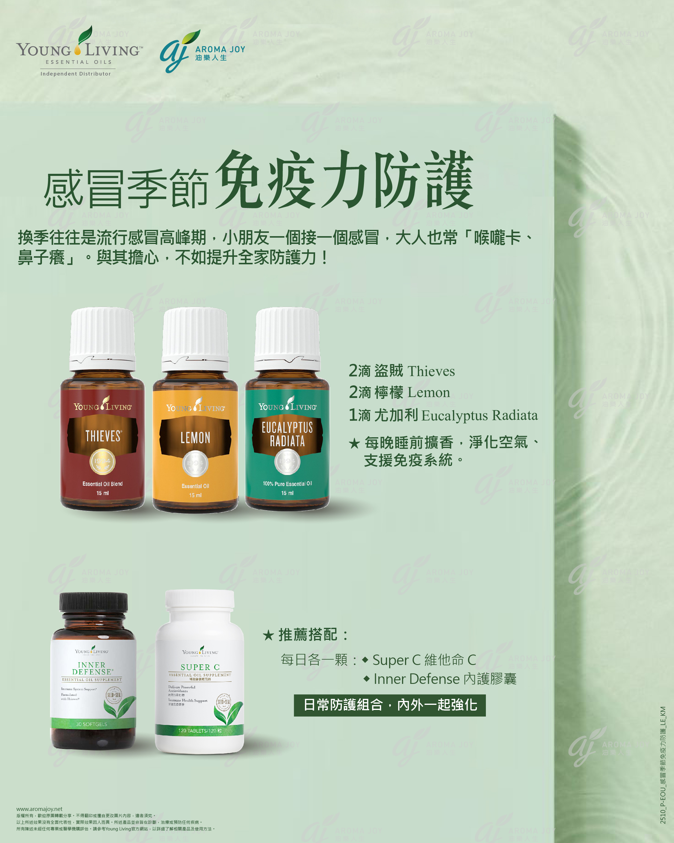 擴香防護配方: 每晚睡前擴香,淨化空氣、支援免疫系統。 推薦搭配: 每日各一顆:Super C 維他命 C + Inner Defense 內護膠囊 → 日常防護組合,內外一起強化。