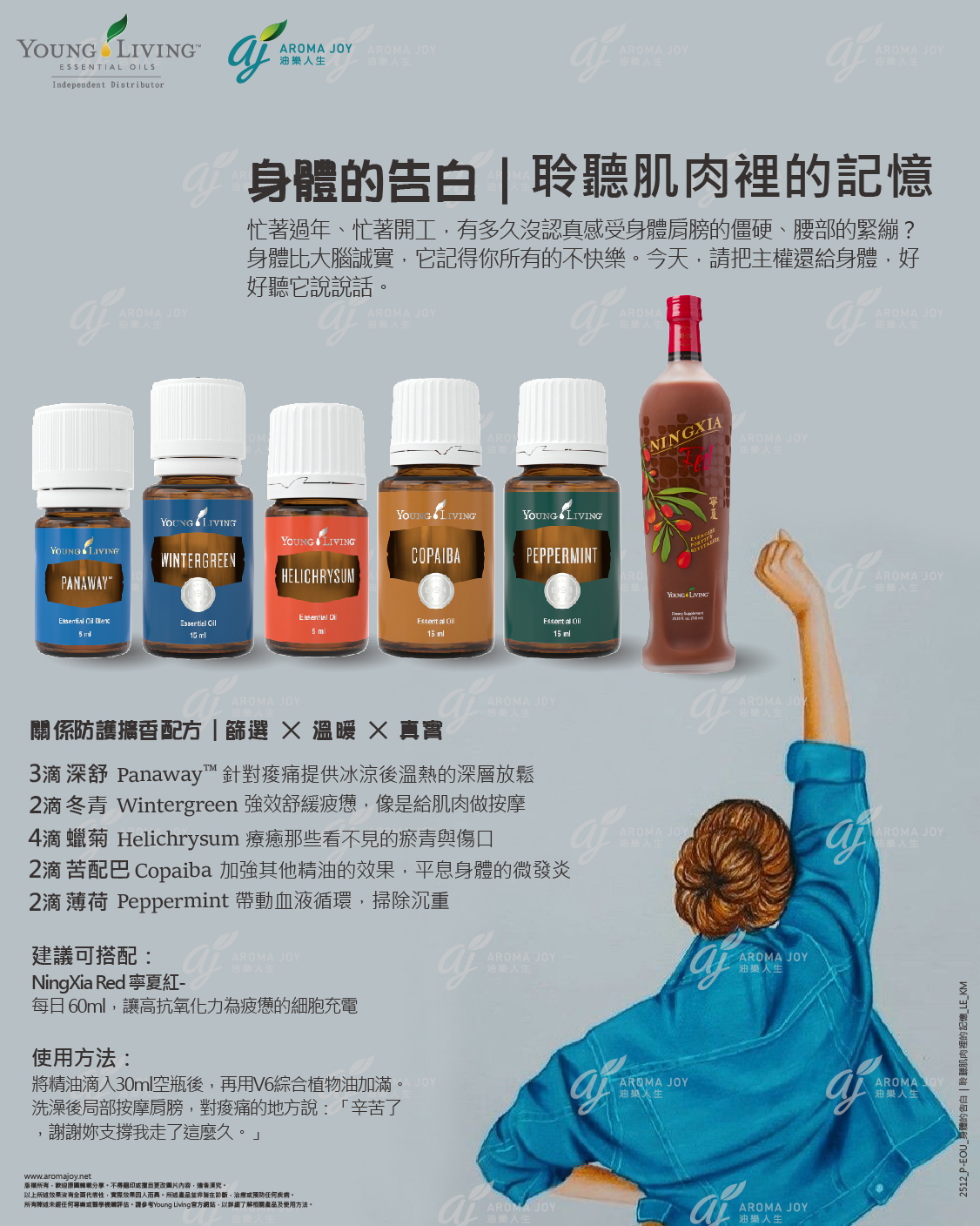 將精油滴入30ml空瓶後,再用V6綜合植物油加滿。洗澡後局部按摩肩膀,對痠痛的地方說:「辛苦了,謝謝妳支撐我走了這麼久。」