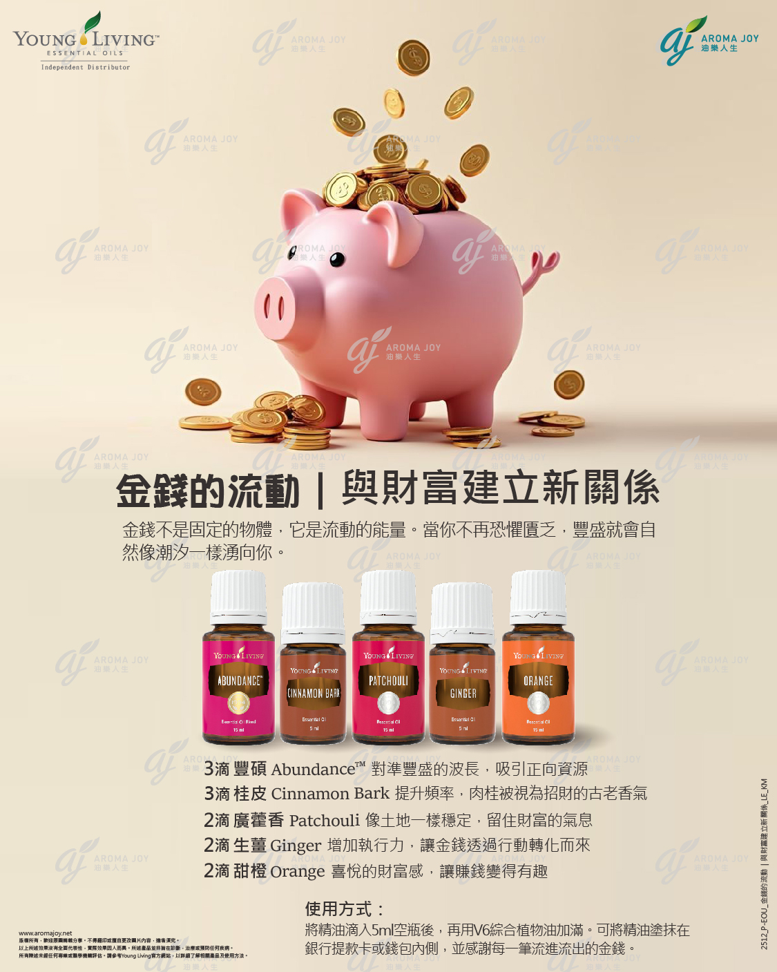 將精油滴入5ml空瓶後,再用V6綜合植物油加滿。可將精油塗抹在銀行提款卡或錢包內側,並感謝每一筆流進流出的金錢。