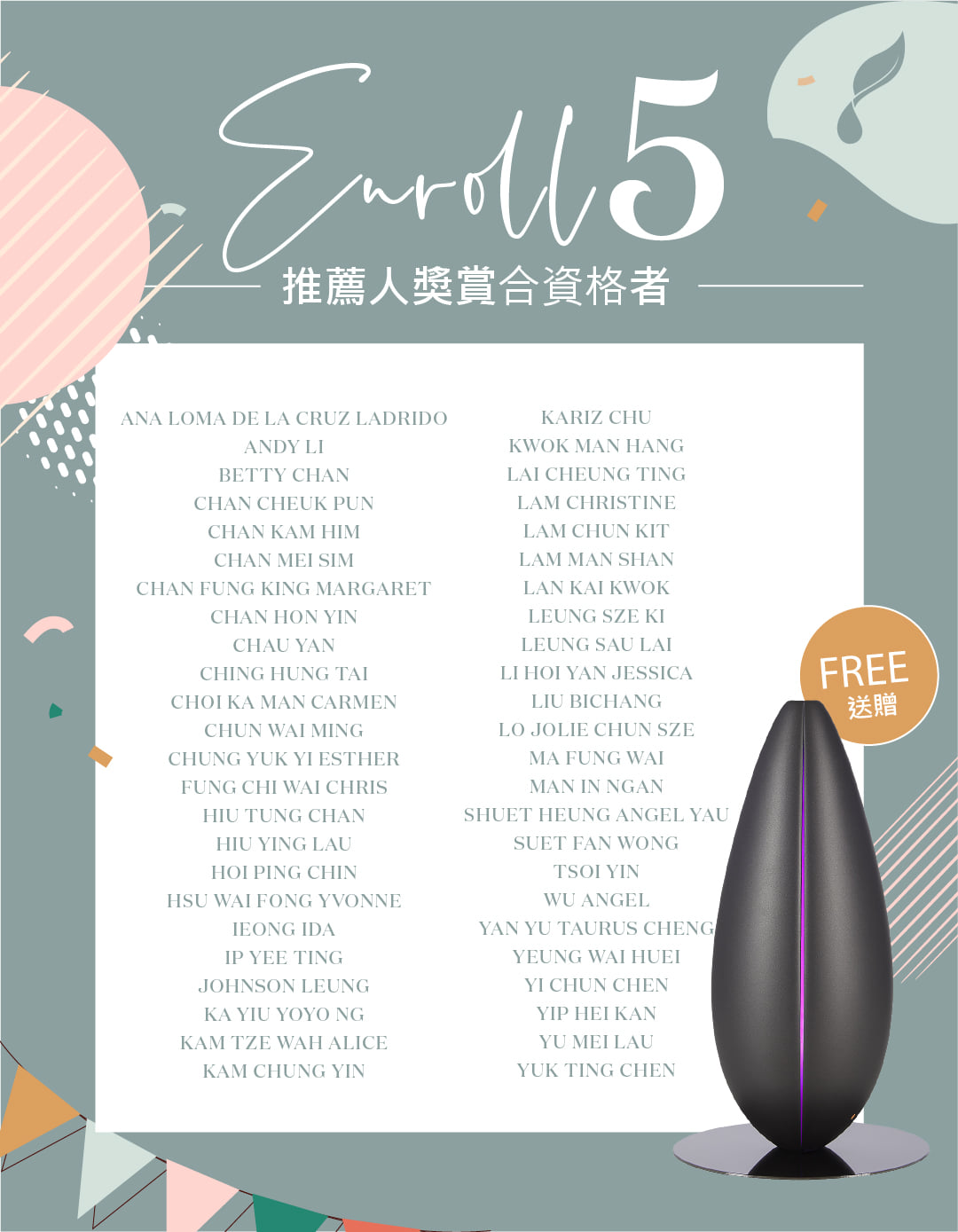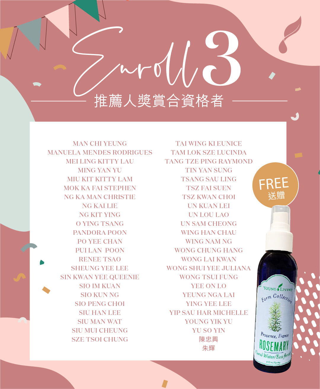這次計劃以「累計推薦」的全新形式,獎賞您於1月1日至3月31日期間推薦新會員的努力!成功推薦的新會員愈多,將會獲得更卓越的獎賞,是次計劃共有171位香港及澳門領袖於考核期內成功推薦3位或以上新會員並合資格獲得獎賞 ,所有得獎者將於本周內收到電郵通知領取獎賞詳情 ,再次恭喜並感謝各位領袖與我們攜手邁步向前,一同建立成功的Young Living事業!